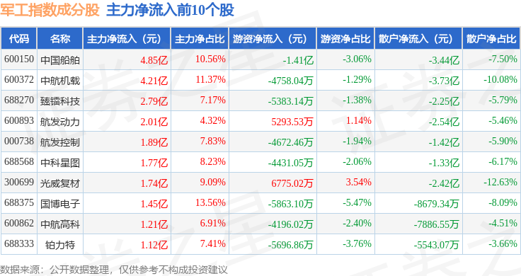 资金流向方面,军工指数(399959)成份股当日主力资金净流入合计25.68亿元,游资资金净流出合计7.68亿元,散户资金净流出合计18.01亿元。成份股资金流向详情见下表: