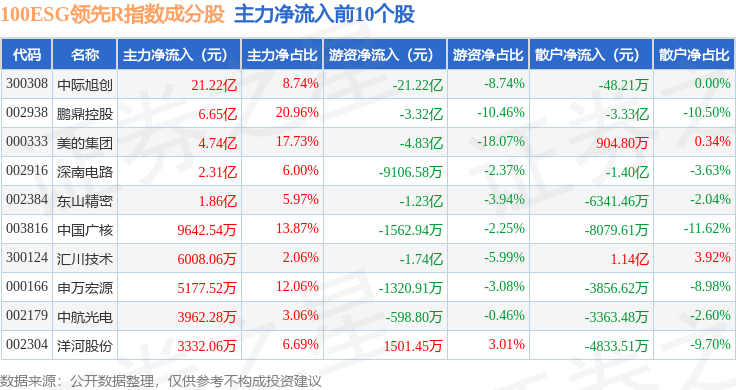 资金流向方面,100ESG领先R(470030)指数成份股当日主力资金净流出合计61.47亿元,游资资金净流出合计17.66亿元,散户资金净流入合计79.13亿元。成份股资金流向详情见下表: