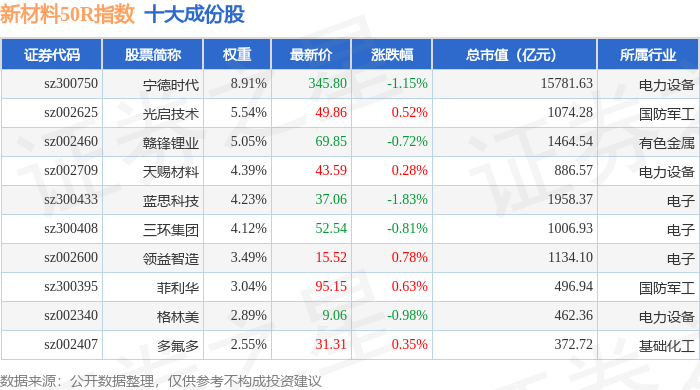 证券之星消息,1月22日,新材料50R(470042)指数报收于4565.26点,涨0.54%,成交929.68亿元,换手率3.13%。当日该指数成份股中,上涨的有27家,三角防务以19.99%的涨幅领涨,下跌的有23家,珂玛科技以5.31%的跌幅领跌。