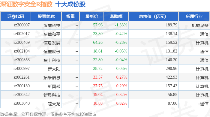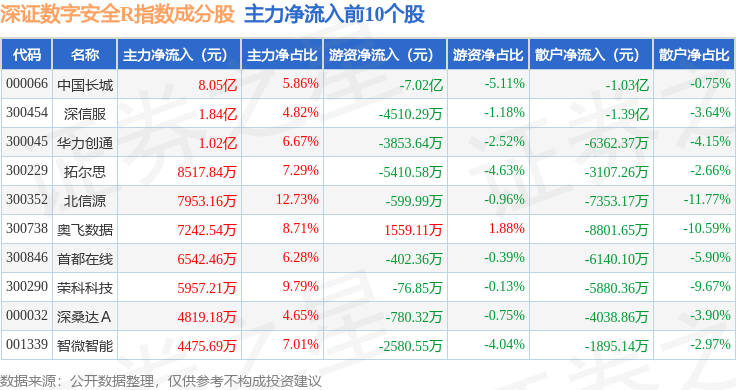 资金流向方面,深证数字安全R(470052)指数成份股当日主力资金净流入合计16.75亿元,游资资金净流出合计7.32亿元,散户资金净流出合计9.43亿元。成份股资金流向详情见下表: