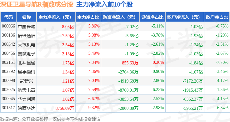 资金流向方面,深证卫星导航R(470050)指数成份股当日主力资金净流入合计28.57亿元,游资资金净流出合计13.16亿元,散户资金净流出合计15.41亿元。成份股资金流向详情见下表: