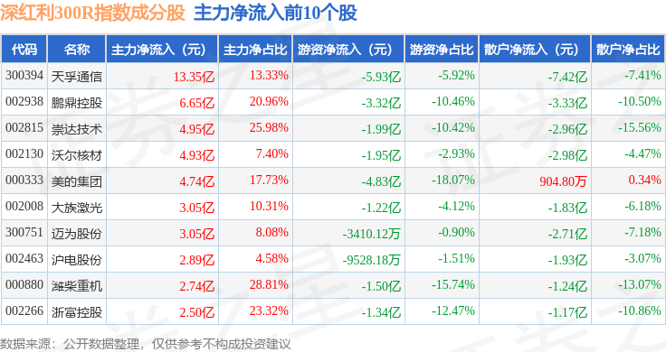 资金流向方面,深红利300R(470062)指数成份股当日主力资金净流出合计40.07亿元,游资资金净流出合计12.74亿元,散户资金净流入合计52.81亿元。成份股资金流向详情见下表: