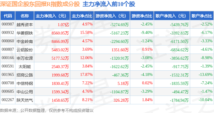 资金流向方面,深证国企股东回报R(470064)指数成份股当日主力资金净流出合计8.72亿元,游资资金净流出合计2.77亿元,散户资金净流入合计11.49亿元。成份股资金流向详情见下表: