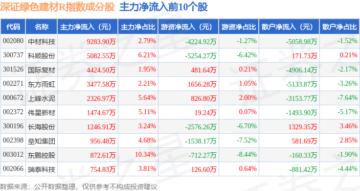 资金流向方面,深证绿色建材R(470077)指数成份股当日主力资金净流入合计2.54亿元,游资资金净流出合计2.31亿元,散户资金净流出合计2325.81万元。成份股资金流向详情见下表: