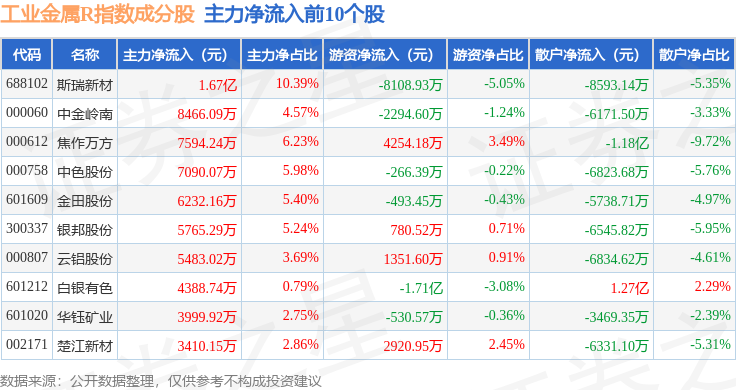 资金流向方面,工业金属R(480043)指数成份股当日主力资金净流出合计29.44亿元,游资资金净流入合计3.48亿元,散户资金净流入合计25.95亿元。成份股资金流向详情见下表: