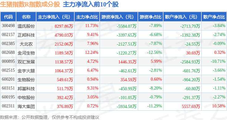 资金流向方面,生猪指数R(480073)指数成份股当日主力资金净流出合计2.84亿元,游资资金净流出合计1.78亿元,散户资金净流入合计4.62亿元。成份股资金流向详情见下表: