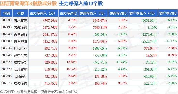 资金流向方面,国证青岛海洋R(480532)指数成份股当日主力资金净流出合计3545.79万元,游资资金净流入合计9435.44万元,散户资金净流出合计6602.46万元。成份股资金流向详情见下表: