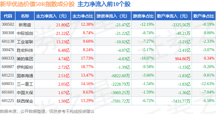 资金流向方面,新华优选价值50R(489004)指数成份股当日主力资金净流出合计21.78亿元,游资资金净流出合计51.4亿元,散户资金净流入合计73.18亿元。成份股资金流向详情见下表: