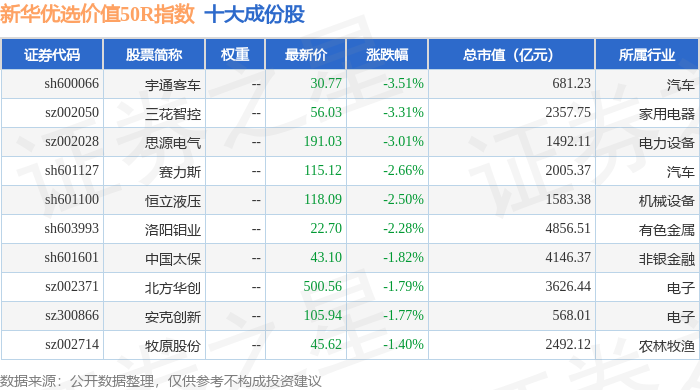 新华优选价值50R(489004)指数十大成份股详情如下: