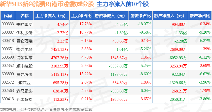 资金流向方面,新华SHS新兴消费R(港币)(489007)指数成份股当日主力资金净流出合计3.64亿元,游资资金净流出合计5.73亿元,散户资金净流入合计9.37亿元。成份股资金流向详情见下表: