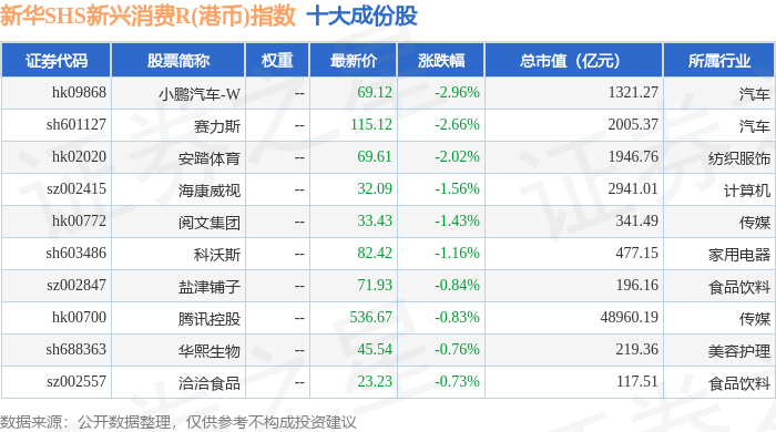 新华SHS新兴消费R(港币)(489007)指数十大成份股详情如下: