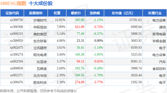 100ESG(970027)指数十大成份股详情如下: