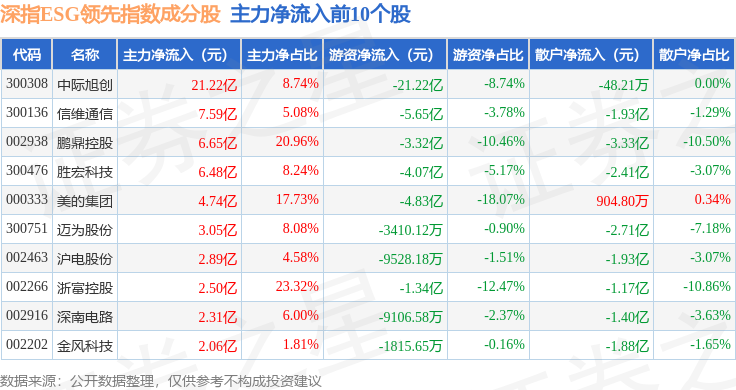 资金流向方面,深指ESG领先(970029)指数成份股当日主力资金净流出合计79.22亿元,游资资金净流出合计26.63亿元,散户资金净流入合计105.85亿元。成份股资金流向详情见下表: