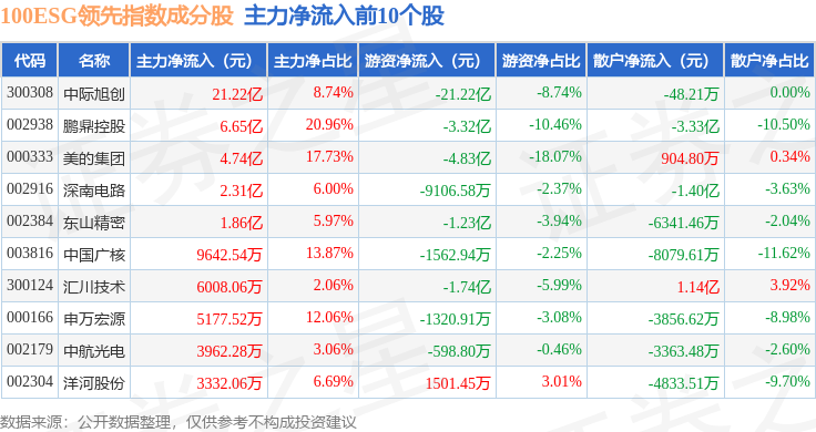 资金流向方面,100ESG领先(970030)指数成份股当日主力资金净流出合计61.47亿元,游资资金净流出合计17.66亿元,散户资金净流入合计79.13亿元。成份股资金流向详情见下表: