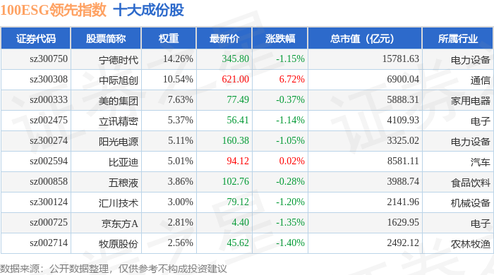 100ESG领先(970030)指数十大成份股详情如下: