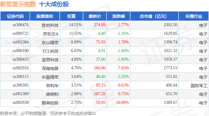 新型显示(970048)指数十大成份股详情如下: