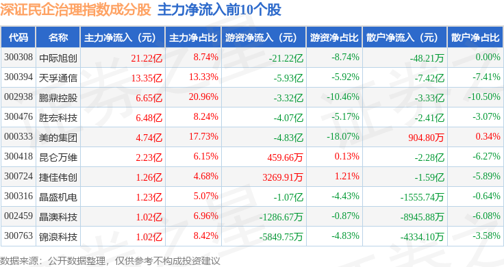 资金流向方面,深证民企治理(970058)指数成份股当日主力资金净流出合计12.43亿元,游资资金净流出合计31.43亿元,散户资金净流入合计43.86亿元。成份股资金流向详情见下表:
