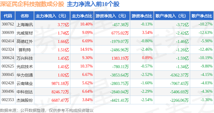 资金流向方面,深证民企科技(970059)指数成份股当日主力资金净流出合计43.49亿元,游资资金净流入合计3.77亿元,散户资金净流入合计39.72亿元。成份股资金流向详情见下表: