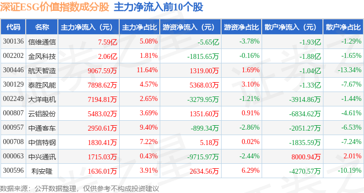 资金流向方面,深证ESG价值(970061)指数成份股当日主力资金净流出合计33.43亿元,游资资金净流入合计6.32亿元,散户资金净流入合计27.1亿元。成份股资金流向详情见下表: