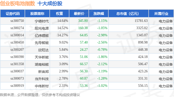 近10日内创业板电池(970081)指数成份股做了调整,剔除了1只股票。