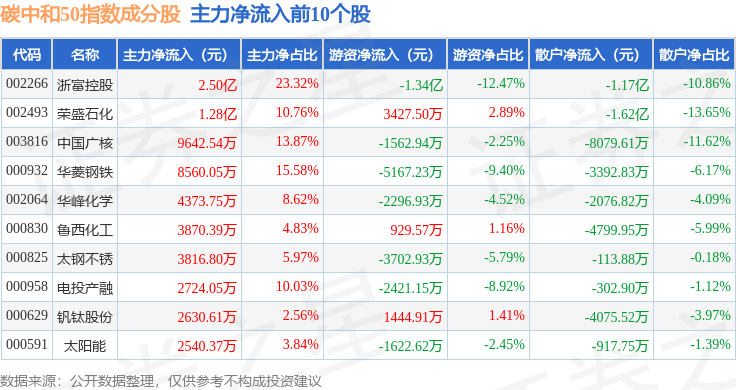 资金流向方面,碳中和50(980021)指数成份股当日主力资金净流出合计27.23亿元,游资资金净流入合计1.69亿元,散户资金净流入合计25.53亿元。成份股资金流向详情见下表: