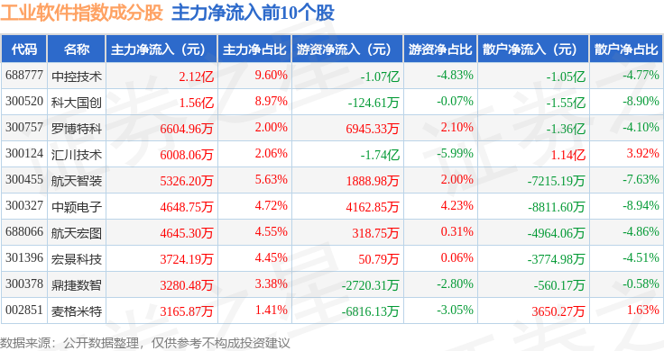 资金流向方面,工业软件(980034)指数成份股当日主力资金净流入合计4917.51万元,游资资金净流出合计6841.41万元,散户资金净流入合计1923.9万元。成份股资金流向详情见下表:
