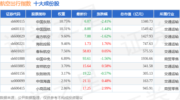 证券之星消息,1月22日,航空出行(980059)指数报收于1705.28点,跌0.14%,成交304.92亿元,换手率1.82%。当日该指数成份股中,上涨的有61家,华联控股以10.05%的涨幅领涨,下跌的有16家,大连圣亚以5.65%的跌幅领跌。