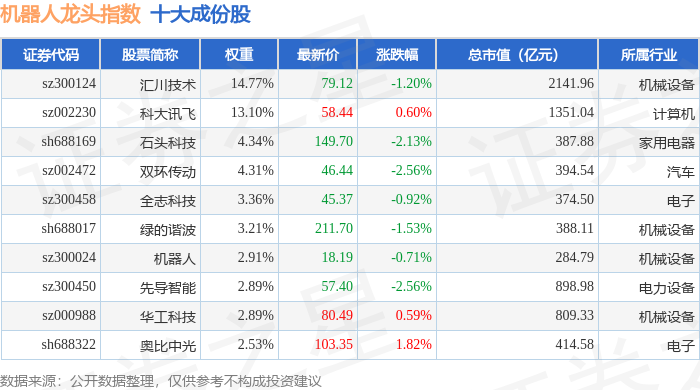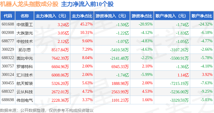 资金流向方面,机器人龙头(980071)指数成份股当日主力资金净流出合计9.55亿元,游资资金净流出合计7716.46万元,散户资金净流入合计10.32亿元。成份股资金流向详情见下表: