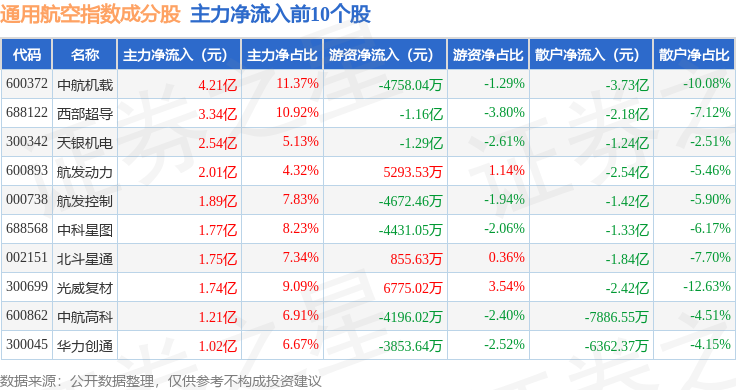 资金流向方面,通用航空(980076)指数成份股当日主力资金净流入合计21.64亿元,游资资金净流出合计1.22亿元,散户资金净流出合计20.42亿元。成份股资金流向详情见下表: