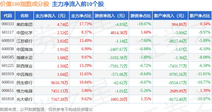 资金流向方面,价值100(980081)指数成份股当日主力资金净流入合计6170.48万元,游资资金净流出合计2.01亿元,散户资金净流入合计1.4亿元。成份股资金流向详情见下表: