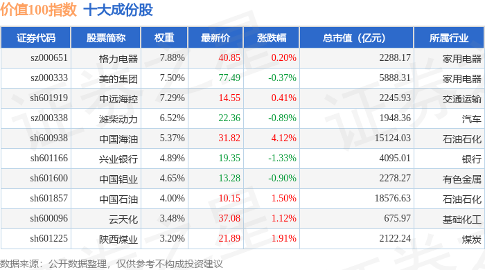 证券之星消息,1月22日,价值100(980081)指数报收于4599.97点,涨0.42%,成交669.0亿元,换手率0.86%。当日该指数成份股中,上涨的有72家,中国海油以4.12%的涨幅领涨,下跌的有24家,鄂尔多斯以2.04%的跌幅领跌。