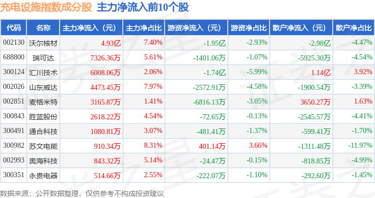 资金流向方面,充电设施(980077)指数成份股当日主力资金净流出合计12.28亿元,游资资金净流出合计4859.2万元,散户资金净流入合计12.72亿元。成份股资金流向详情见下表:
