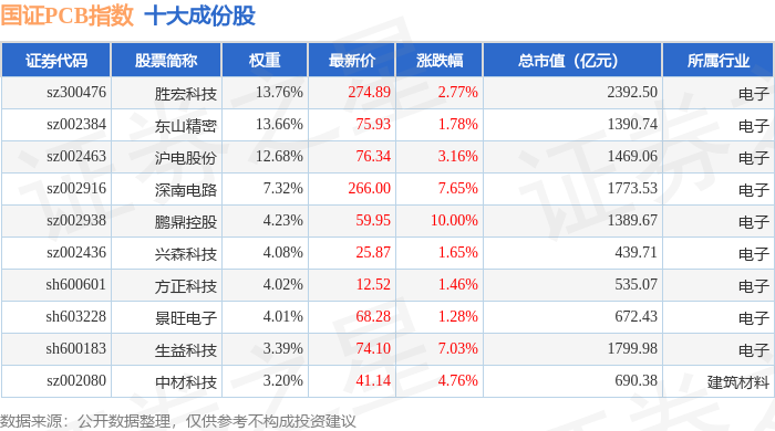 国证PCB(980115)指数十大成份股详情如下: