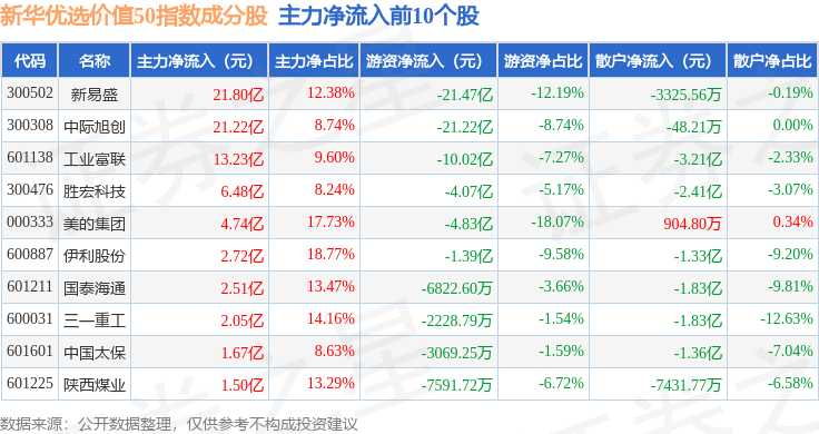 资金流向方面,新华优选价值50(989004)指数成份股当日主力资金净流出合计21.78亿元,游资资金净流出合计51.4亿元,散户资金净流入合计73.18亿元。成份股资金流向详情见下表: