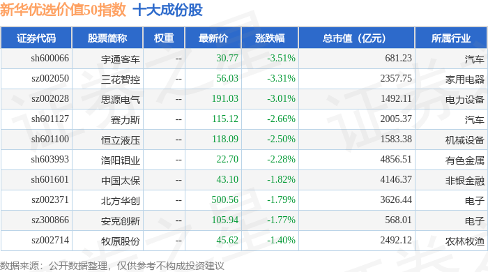 新华优选价值50(989004)指数十大成份股详情如下: