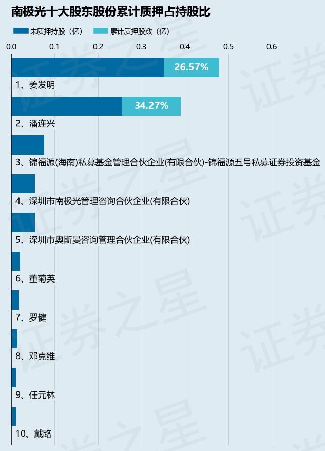 截止本公告日,股东姜发明已累计质押股份1273.0万股,占其持股总数的26.57%,股东潘连兴已累计质押股份1336.0万股,占其持股总数的34.27%。本次质押后南极光十大股东的累计质押股份占持股比例(占持股比例的计算以公司最新一期财务报表公布的十大股东的持股总数为基准)见下图: