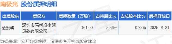 证券之星消息,南极光(300940)1月22日公开信息显示,股东姜发明向深圳市高新投小额贷款有限公司合计质押161.0万股,占总股本0.72%。质押详情见下表: