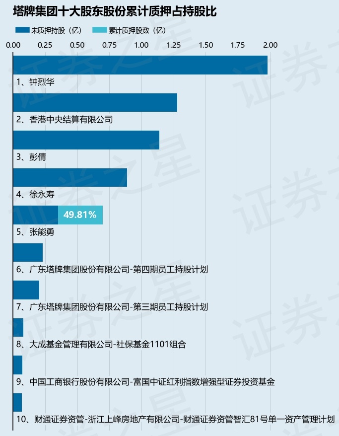 截止本公告日,股东张能勇已累计质押股份3472.0万股,占其持股总数的49.81%。本次质押后塔牌集团十大股东的累计质押股份占持股比例(占持股比例的计算以公司最新一期财务报表公布的十大股东的持股总数为基准)见下图: