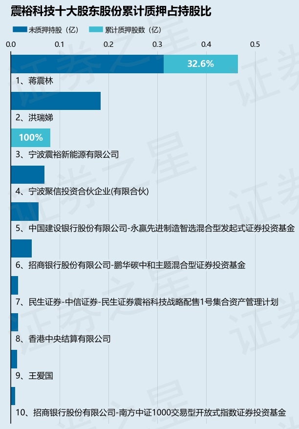 截止本公告日,股东蒋震林已累计质押股份1516.0万股,占其持股总数的32.6%,股东宁波震裕新能源有限公司已累计质押股份815.04万股,占其持股总数的100.0%。本次质押后震裕科技十大股东的累计质押股份占持股比例(占持股比例的计算以公司最新一期财务报表公布的十大股东的持股总数为基准)见下图: