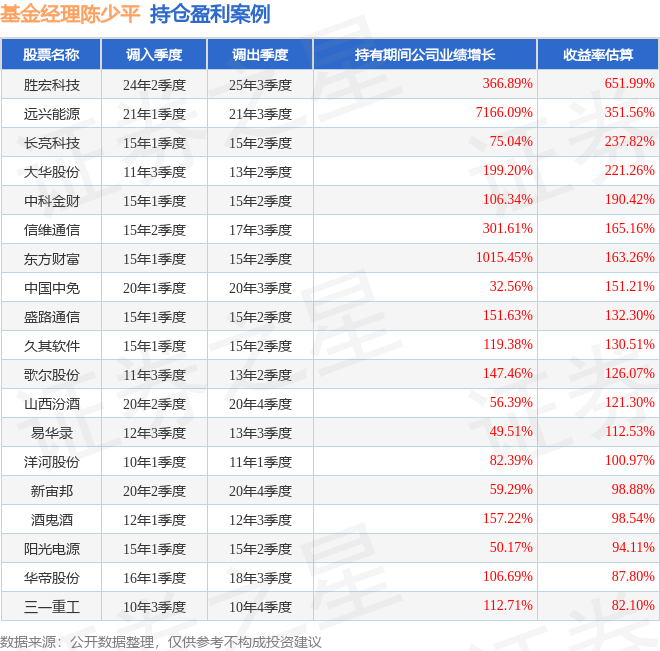 陈少平管理的广发改革混合基金在24年2季度买入胜宏科技,在持有1年又1个季度后在25年3季度卖出。持有期间的估算收益率为651.99%,持有期间胜宏科技在2024年到2025年的中报归属净利润增幅达366.89%。