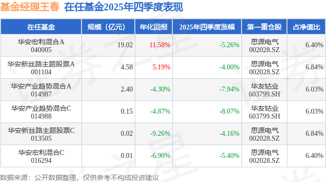 证券之星消息,截止2025年四季度末,基金经理王春旗下共管理6只基金,本季度表现最佳的为华安新丝路主题股票A(001104),季度净值跌4.0%。