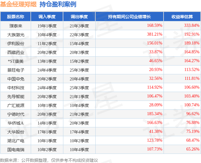 郑煜管理的华夏收入混合基金在20年3季度买入宁德时代,在持有3个季度后在21年2季度卖出。持有期间的估算收益率为96.62%,持有期间宁德时代在2020年到2021年的年报归属净利润增幅达185.34%。