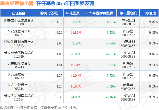 徐小勇管理的长安裕隆混合A基金在23年1季度买入中际旭创,在持有1年又3个季度后在24年4季度卖出。持有期间的估算收益率为454.05%,持有期间中际旭创在2023年到2024年的年报归属净利润增幅达137.93%。