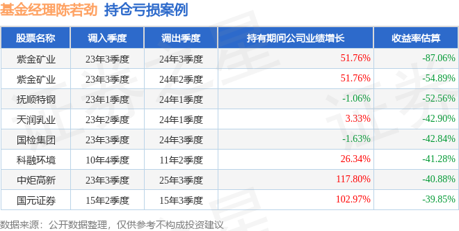 陈若劲管理的红土创新稳益6个月持有期混合A基金在23年3季度买入紫金矿业,在持有1年又0个季度后在24年3季度卖出。持有期间的估算收益率为-87.06%,持有期间紫金矿业在2023年到2024年的年报归属净利润增幅达51.76%。
