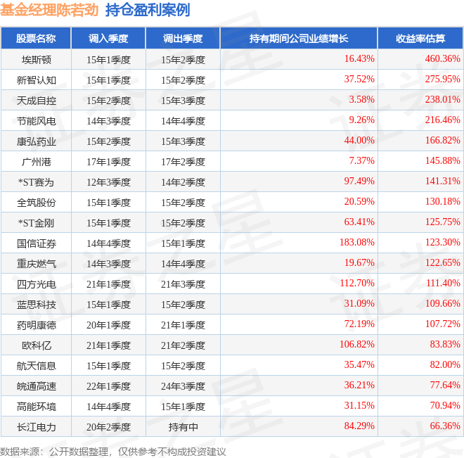 陈若劲管理的宝盈祥瑞混合A基金在15年1季度买入埃斯顿,在持有1个季度后在15年2季度卖出。持有期间的估算收益率为460.36%,持有期间埃斯顿在2014年到2015年的年报归属净利润增幅达16.43%。