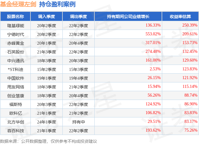 左剑管理的中海积极增利混合基金在20年2季度买入隆基绿能,在持有2年又0个季度后在22年2季度卖出。持有期间的估算收益率为250.39%,持有期间隆基绿能在2020年到2022年的年报营业总收入增幅达136.33%。