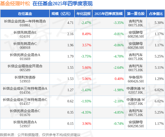 证券之星消息,截止2025年四季度末,基金经理叶松旗下共管理10只基金,本季度表现最佳的为长信利发债券(519933),季度净值涨0.4%。