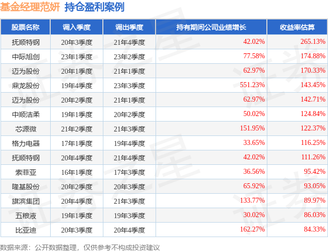 范妍管理的圆信永丰优加生活基金在20年3季度买入抚顺特钢,在持有1年又1个季度后在21年4季度卖出。持有期间的估算收益率为265.13%,持有期间抚顺特钢在2020年到2021年的年报归属净利润增幅达42.02%。