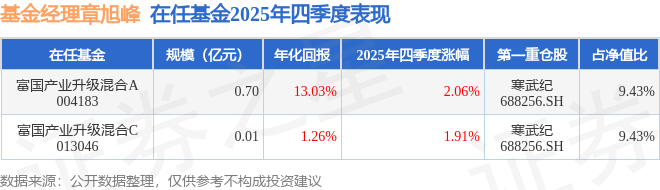 证券之星消息,截止2025年四季度末,基金经理章旭峰旗下共管理2只基金,本季度表现最佳的为富国产业升级混合A(004183),季度净值涨2.06%。