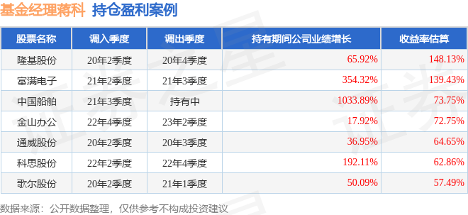 蒋科管理的广发趋势动力混合A基金在20年2季度买入隆基股份,在持有2个季度后在20年4季度卖出。持有期间的估算收益率为148.13%,持有期间隆基股份在2019年到2020年的年报营业总收入增幅达65.92%。